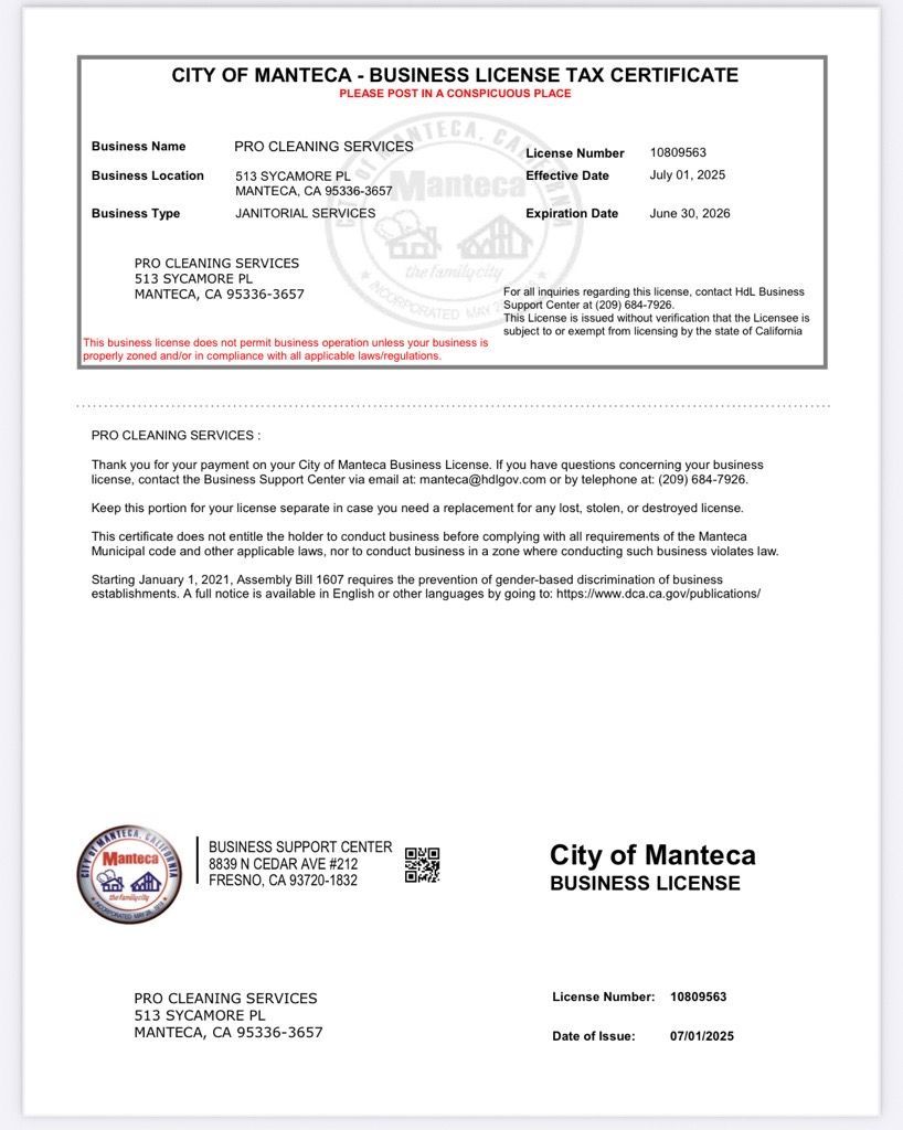Keeping your home or workplace clean is essential for comfort, health, and productivity. At Pro Cleaning Services, we proudly provide dependable and detail-oriented cleaning solutions in Manteca, California, designed to fit your lifestyle and business needs. Whether you require weekly upkeep, biweekly visits, or a thorough deep cleaning, our team is ready to deliver outstanding results. We specialize in residential, commercial, office, and Airbnb cleaning services with flexible scheduling options. Call 2097401009 today to schedule your cleaning and experience the difference of a truly refreshed space.